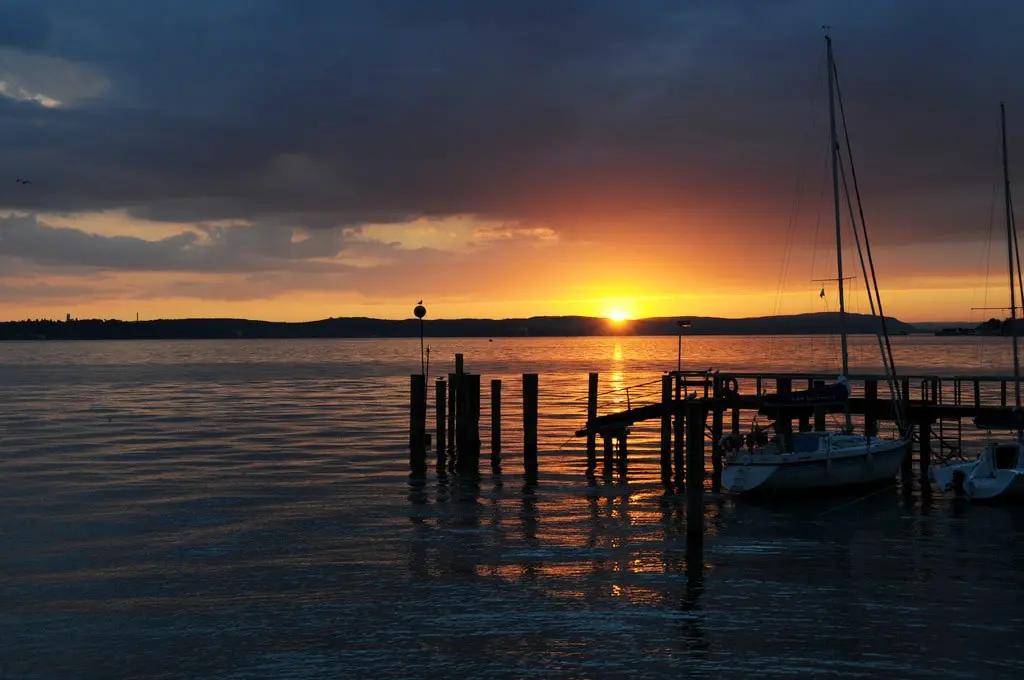 See im Alpenvorland und beliebtes Touristenziel mit Urlaubsorten und saisonalen Wassersportangeboten